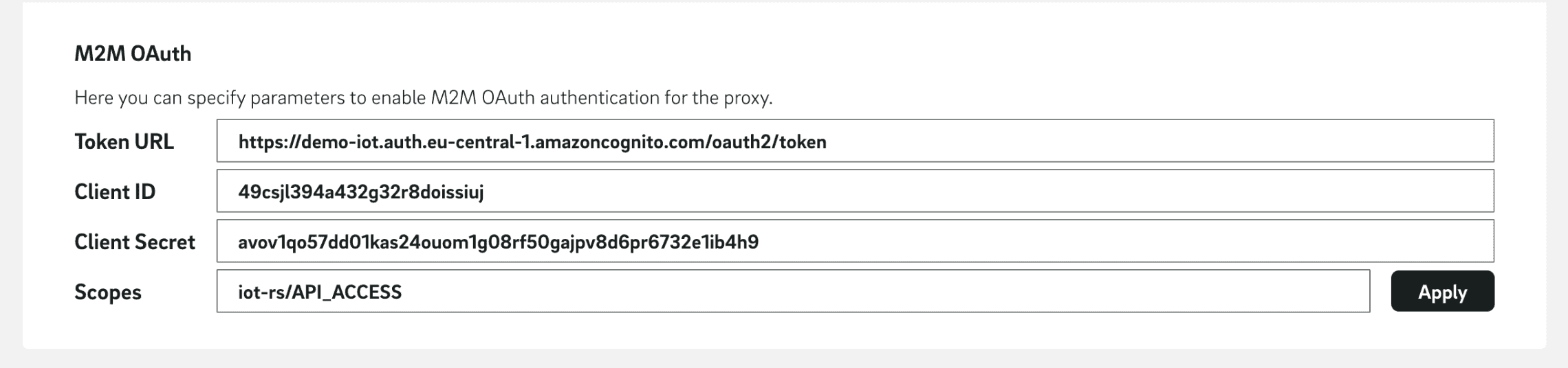 The second variant uses the M2M OAuth flow (also referred to client credentials flow). Here, the proxy uses predefined credentials (client ID and client secret) and scopes to retrieve a token via the token URL. The proxy uses this token accordingly for communication with the HTTP backend. If the token specifies an expires_in, the token is cached and not requested again until it expires. This prevents unnecessary latency and load on the IDP (Identity Provider). This variant can also be specified via the configuration page of the portal.