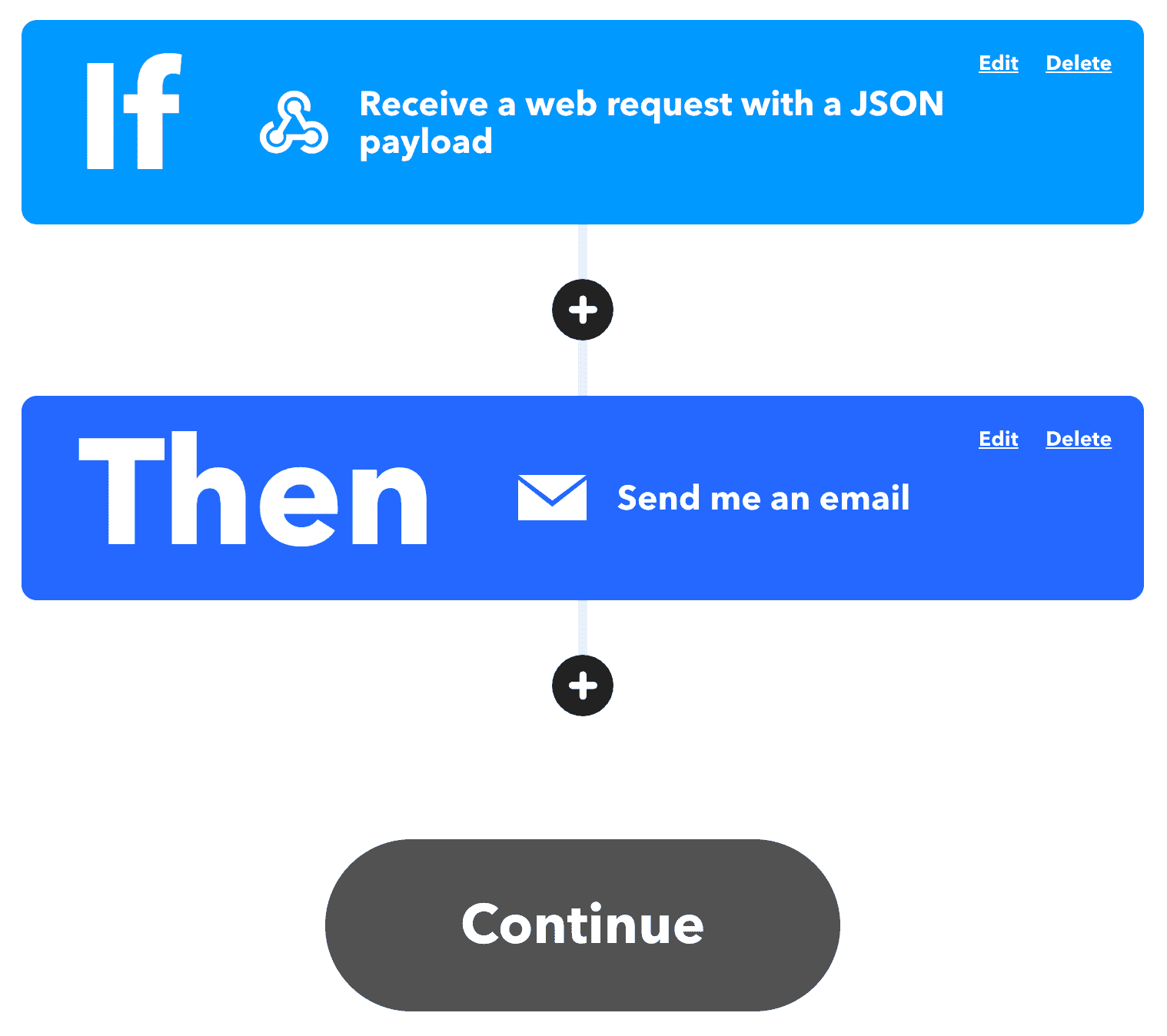 IFTTT (If This Then That) is a web and mobile application, some of which are free, that enables connections between various online services and devices. So-called "applets" are used to set up these connections. In this example, you use an applet that automatically triggers an action (email) when a certain trigger (webhook) occurs.