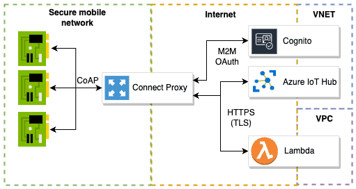 The IoT device can now send messages to the proxy using CoAP, which are then passed on to the Lambda function with the appropriate URL and the Authorization header. The URL of the proxy is coap://proxy.connect-internal.iot-sim.tech:5683 (only accessible from the network of IoT SIM).