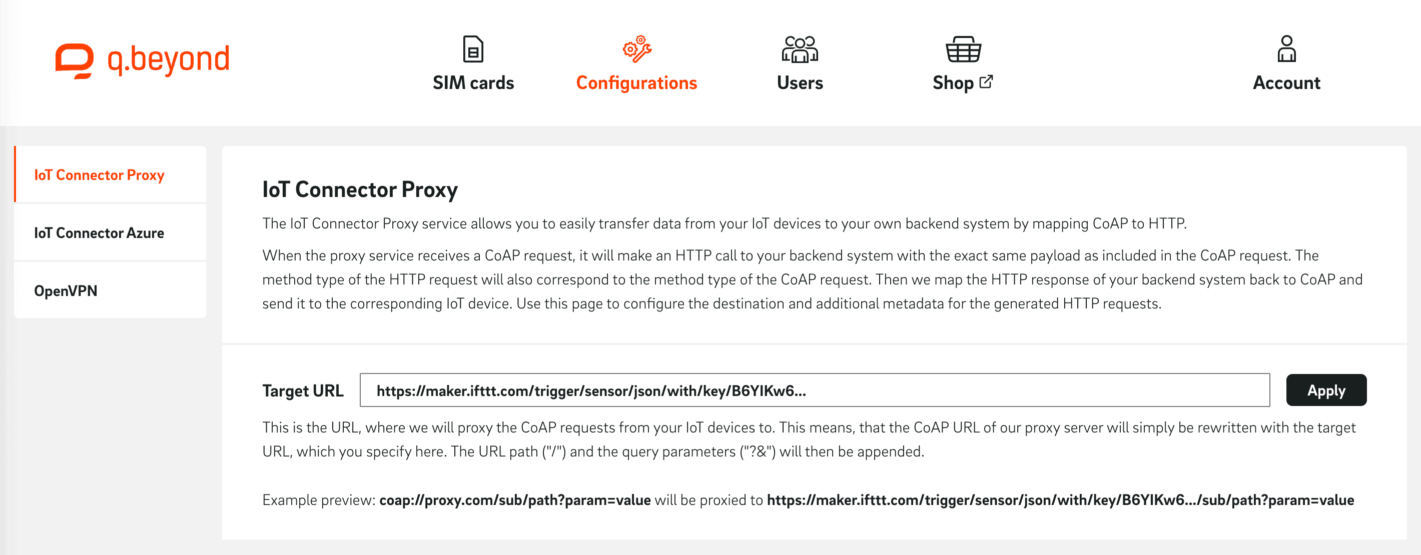 In this step, we store the previously generated webhook URL in the proxy configuration. To do this, open the IoT SIM portal, navigate to the "Configurations" tab, and select "IoT Connector Proxy" there. Paste the previously generated webhook URL into the text field next to "Target URL" and confirm the entry with "Apply".