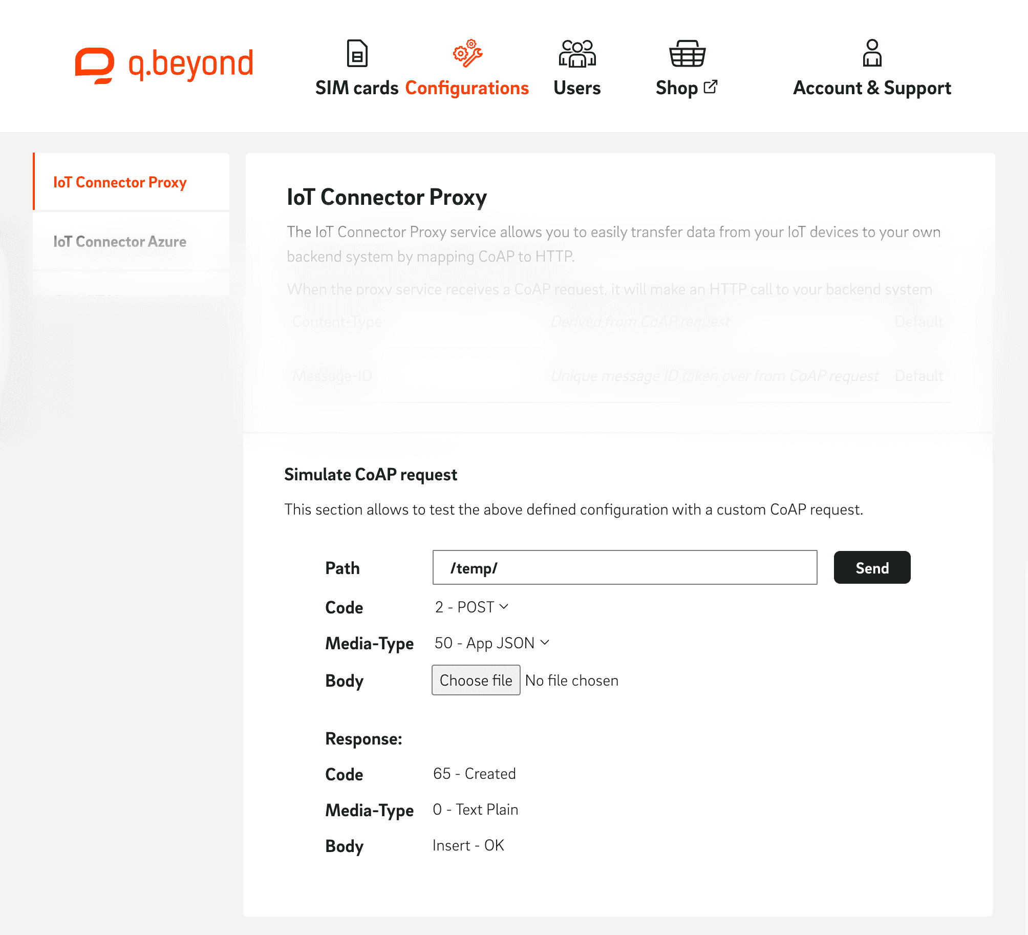 The IoT device can now send messages to the proxy using CoAP, which are then passed to the applet webhook. The URL of the proxy is coap://proxy.connect-internal.iot-sim.tech:5683 (only accessible from IoT SIM's network). For a first test, the body of the message can contain the following JSON data: