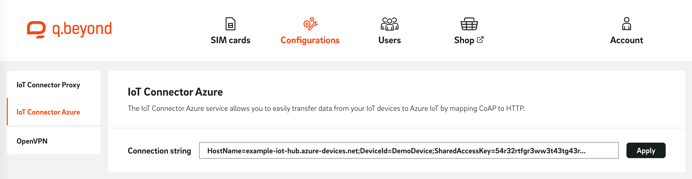 In this step, you store the previously received "Primary connection string" of the device in the proxy configuration. To do this, open the IoT SIM portal, navigate to the "Configurations" tab, and select "IoT Connector Azure". Enter the corresponding value under "Connection string" and apply it by clicking "Apply".