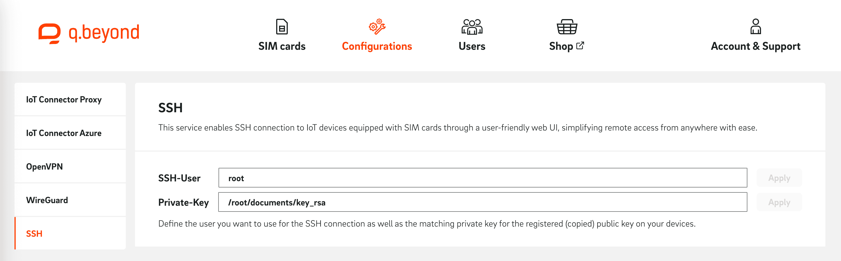After the device preparation, open the IoT SIM portal, navigate to the "Configurations" tab, and select "SSH".